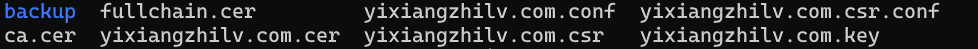 acme.sh --issue --dns dns_ali -d yixiangzhilv.com -d *.yixiangzhilv.com # 申请的域名,我这里申请了通配符到了这一步,你就可以在 ~/.acme.sh/yixiangzhilv.com 下看到以下文件了: