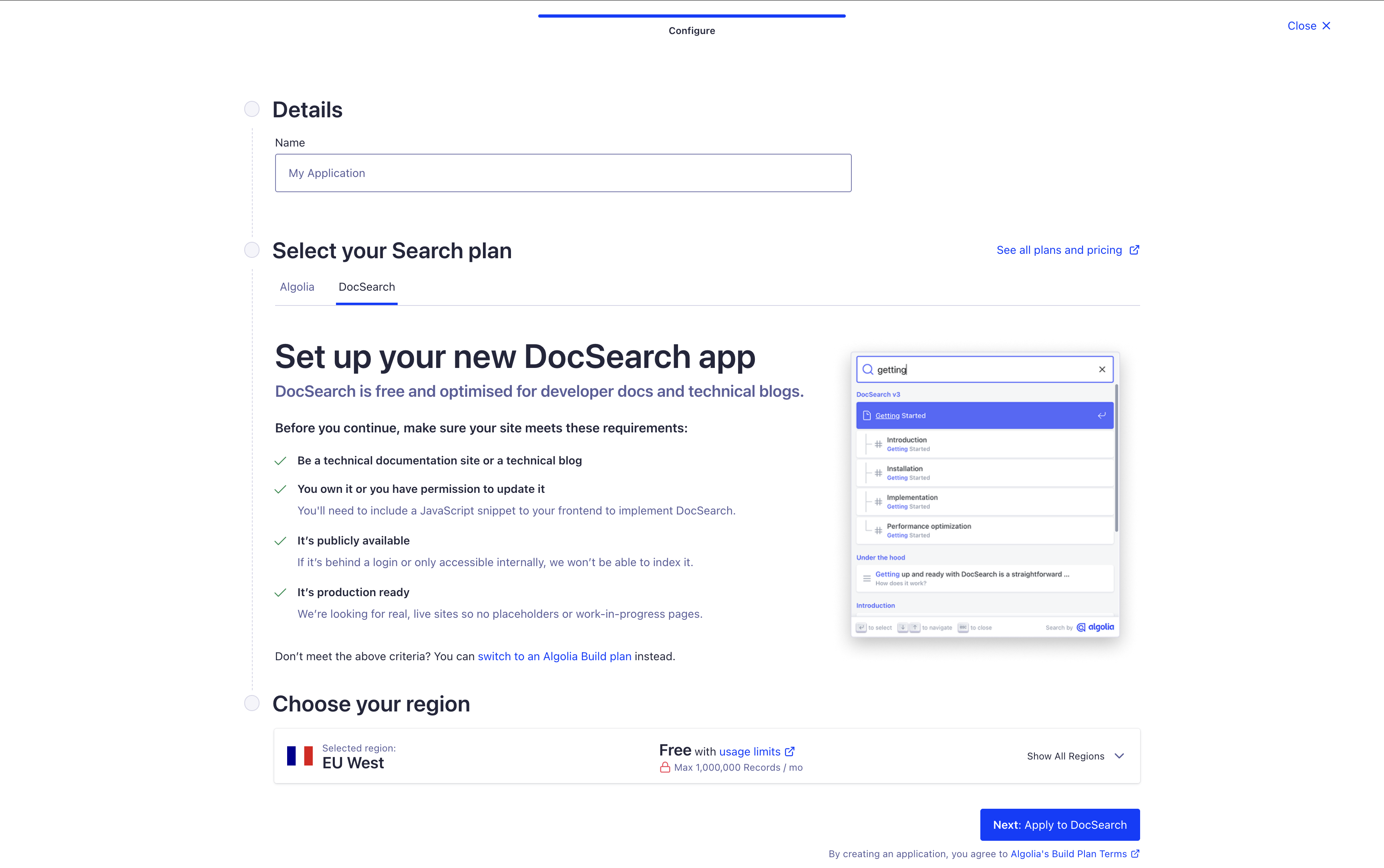 首先访问 DocSearch 主页,在此页面点击“Sign Up”,经过一系列注册和登录操作后,你应该能看到如下界面: