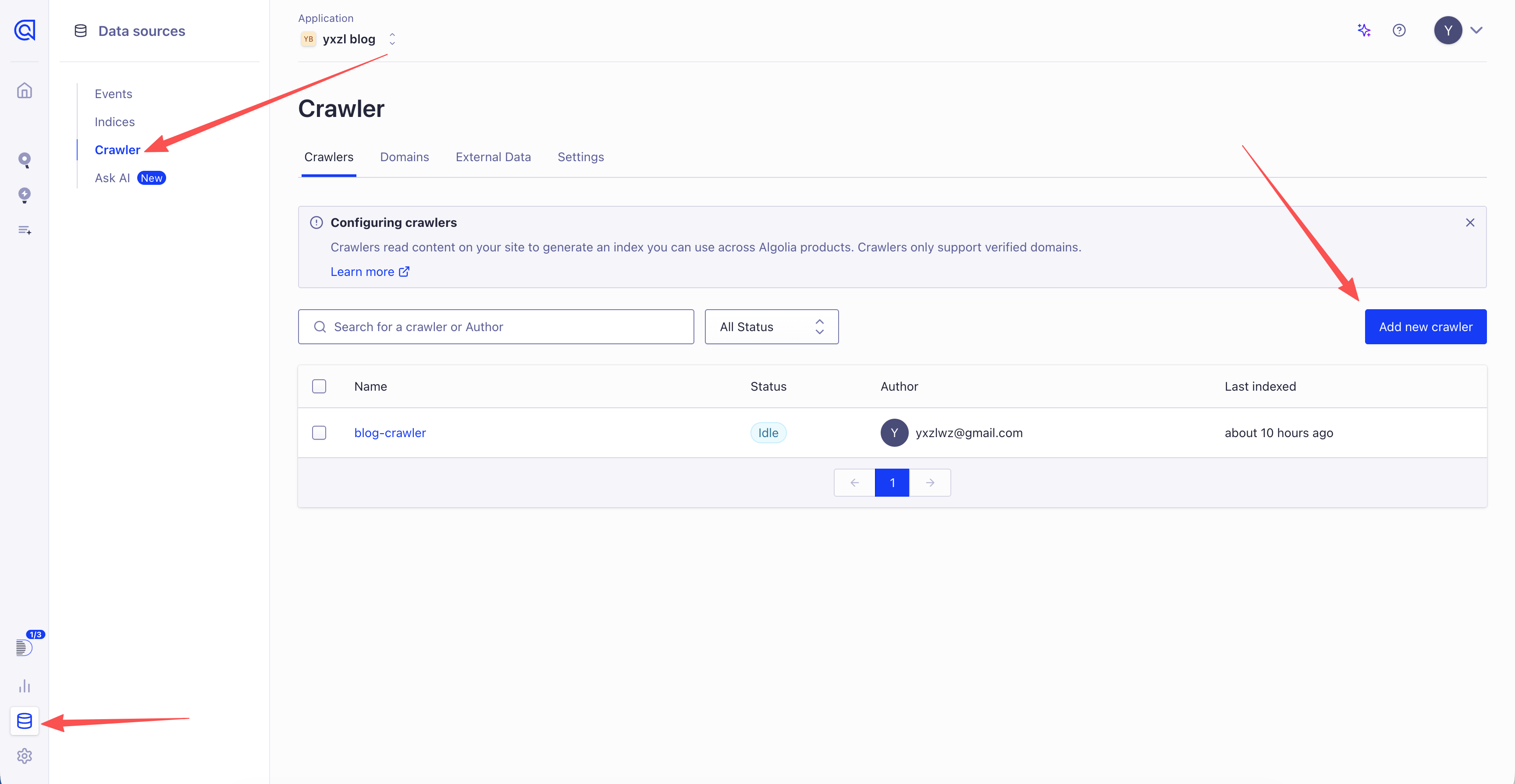 在控制台中,点击左下角的 Data Sources 按钮,再点击 Crawler,即可添加或管理爬虫。