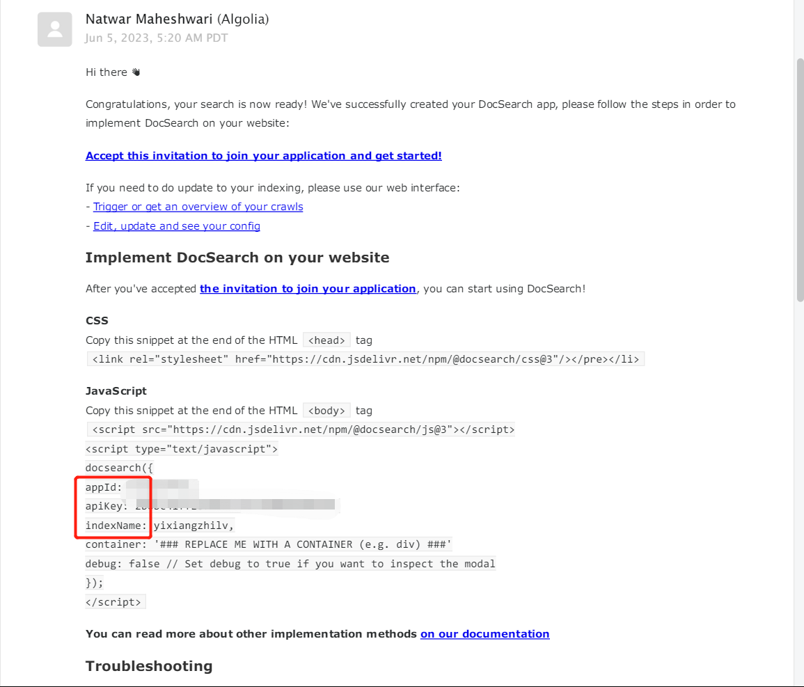 在官方发来的邮件中,提取出 appId apiKey 和 indexName 三个信息,然后根据自己使用的 Vuepress 框架的文档进行配置即可。