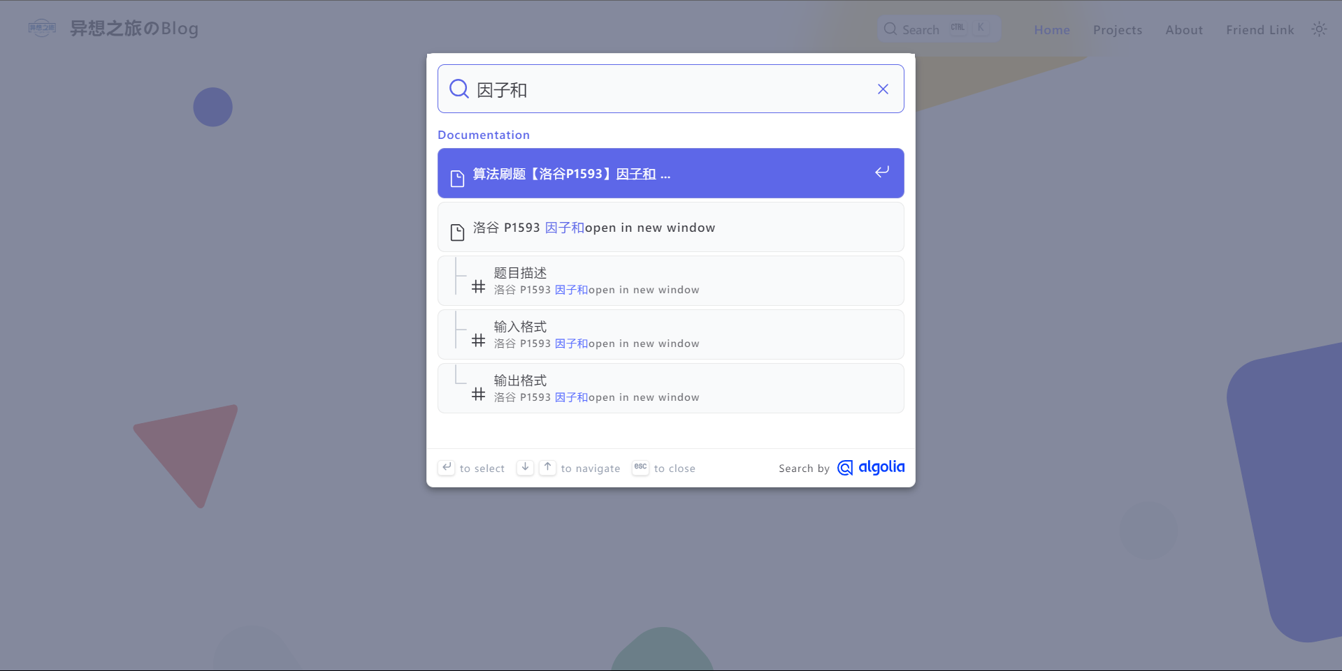 配置完成后,请尝试搜索一个关键词(确保你的网站中有文档包含这一关键词),如果正常返回了搜索结果,那么恭喜你已经完成了配置;如果你和我一样,搜什么都是 No Results,那么请继续往下看。