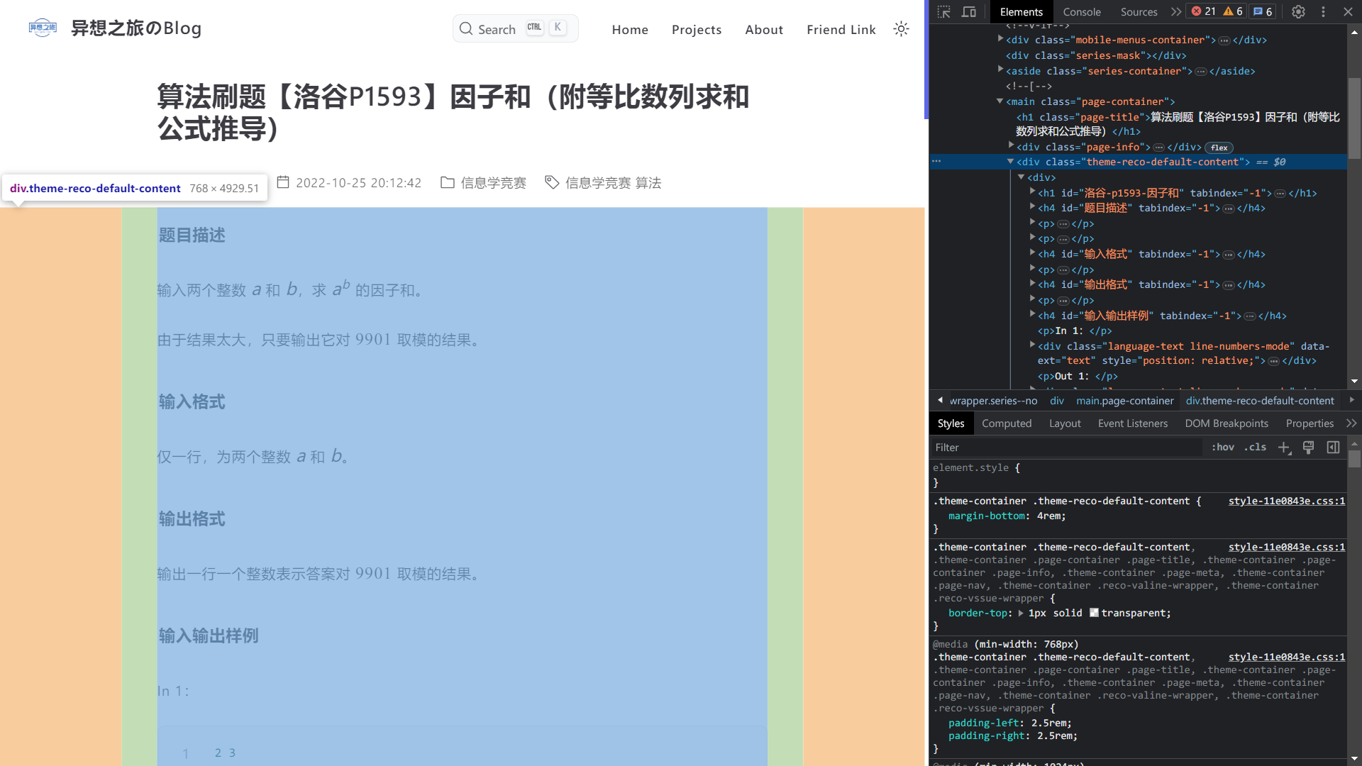 以 vuepress-theme-reco 主题为例,打开任意文章后,使用浏览器检查工具,我们可以看到所有内容都被包裹在 .theme-reco-default-content 中: