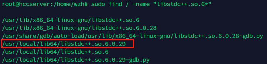 sudo find / -name "libstdc++.so.6*"这一条命令的运行时间较长,约1-2min,请耐心等待。