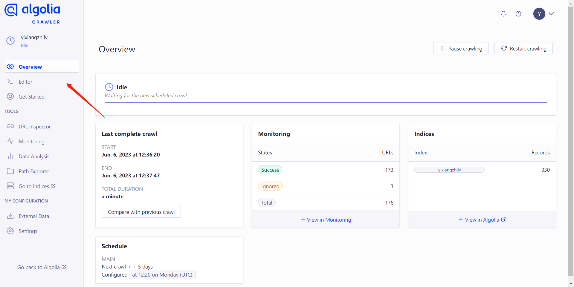 在此之后点击上图中 4 标注的小眼睛回到 Overview 界面,点击右上角的 Restart crawling 按钮重新启动爬虫,然后耐心等待爬取完成就可以啦!