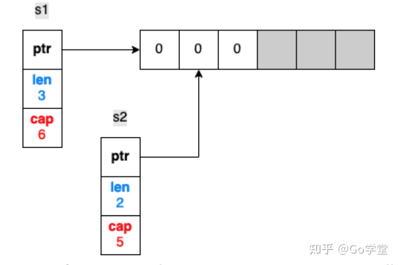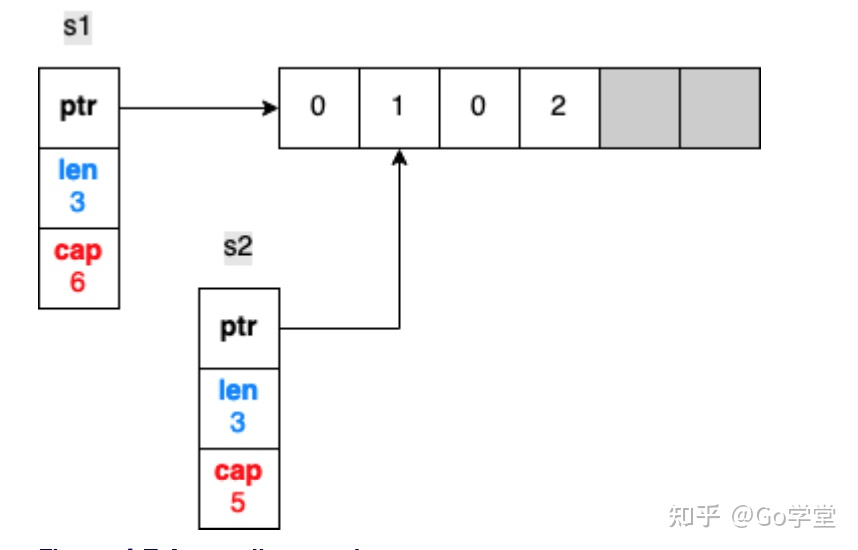 首先,s1被初始化成一个长度为3,容量为6的切片。当通过切分s1创建s2切片时,s1和s2的指针字段都指向同一个后端数组。但是,s2的第一个元素的索引是从数组的索引1开始的。因此,切片s2的长度和容量是和s1不同的:长度为2,容量为5.