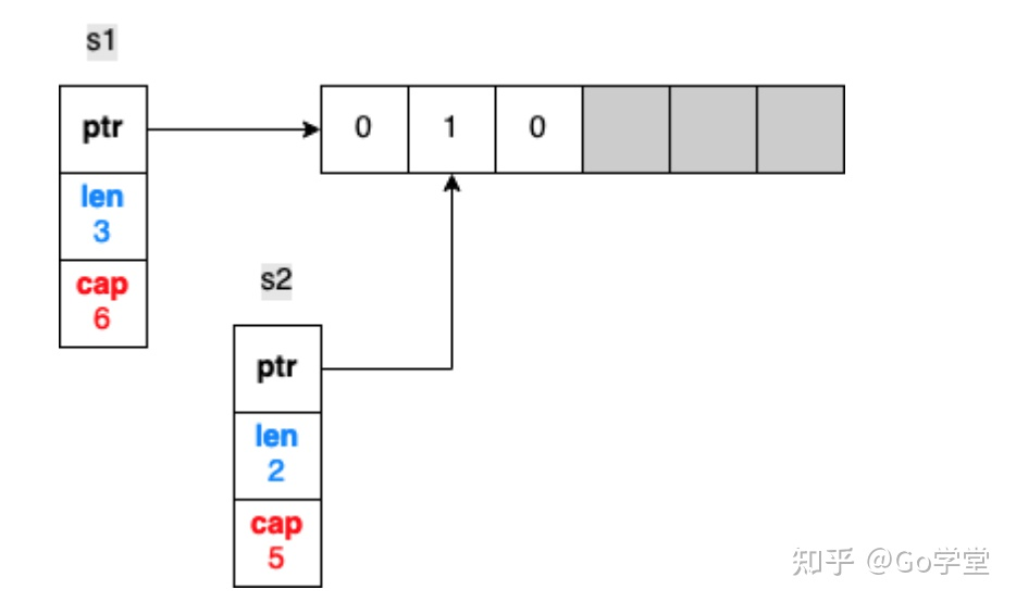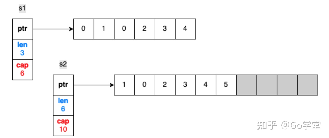 注意,这时s1和s2分别指向了两个不同的数组。实际上,s1依然是一个长度为3,容量为6的切片,同时也有一些可用的buffer空间,因此,它依然是引用了最初的那个数组。同时,新创建的数组,会从s2的起始位置将数据拷贝到自己的空间上来。这也就是为什么新数组的第一个元素是1,而不是0的原因。