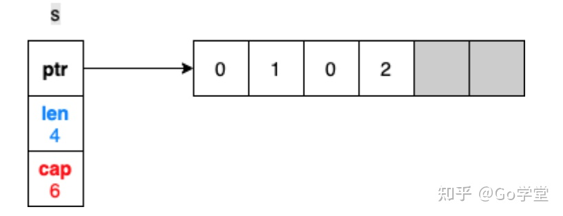 但是,不允许访问切片长度(length)以外的元素,即使长度以外的内存空间也已经被分配了。例如,s[4] = 0 会引发panic: