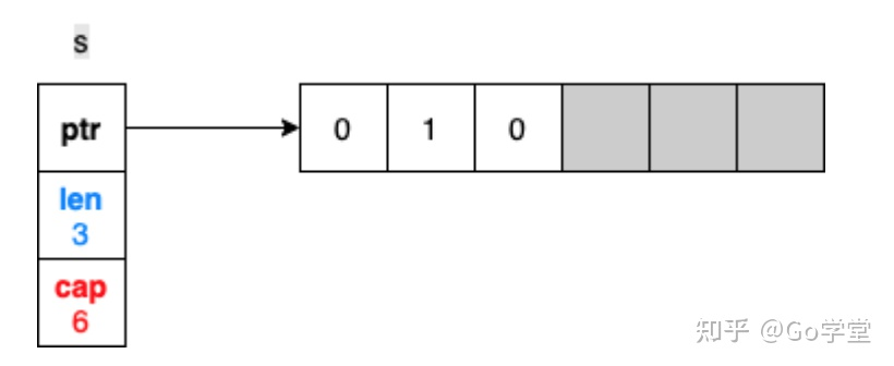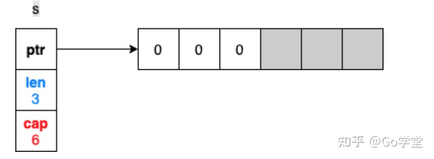 s := make([]int, 3, 6) // ①① 第二个参数3代表长度(length),第三个参数6代表容量(capacity)