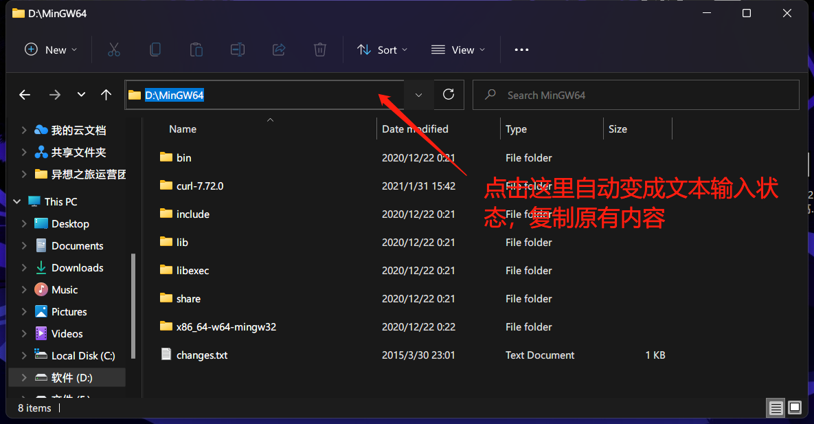 打开MinGW的存放路径,点击上方地址栏复制路径