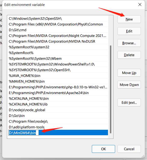 双击打开Path,添加一条,内容为你刚刚复制的路径(例 D:\MinGW64\bin)