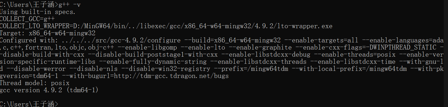 重启计算机(建议以避免不必要的麻烦,非必须),然后打开cmd输入 g++ -v ,如果看到这样的结果证明环境配置成功了:
