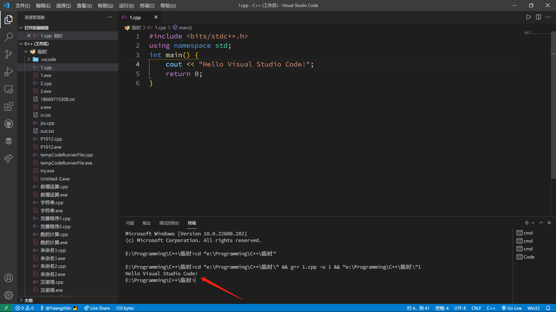 一切准备就绪!现在新建一个cpp文件,编写好后点击右上角的运行按钮或按下 Ctrl + Alt + N ,即可运行程序!
