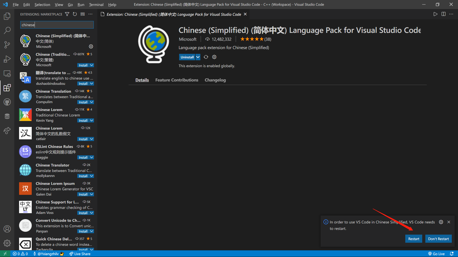 安装好后根据右下角提示restart