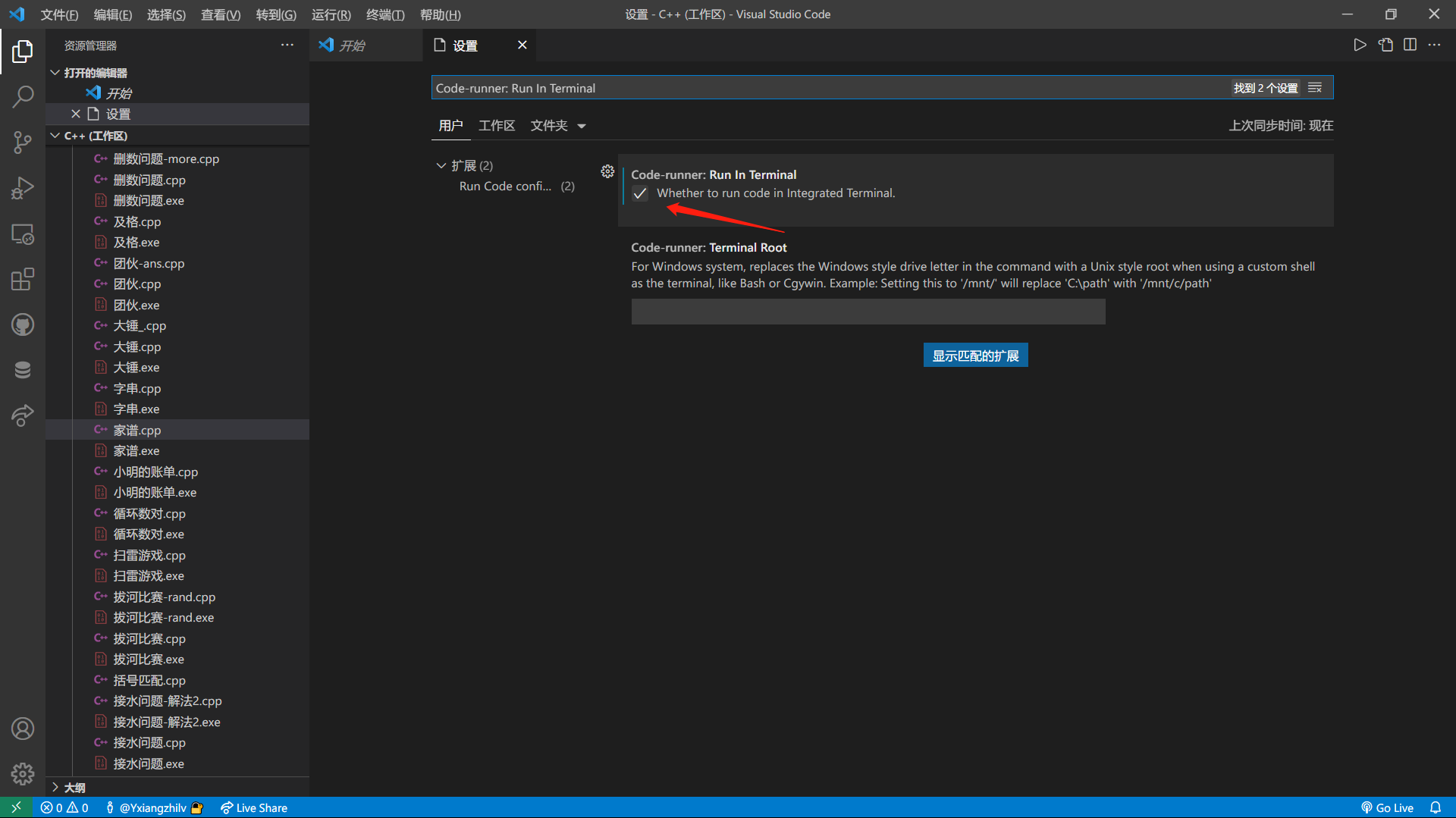 按下快捷键 Ctrl + , 打开设置界面,搜索框输入 Code-runner: Run In Terminal ,然后打上这个勾