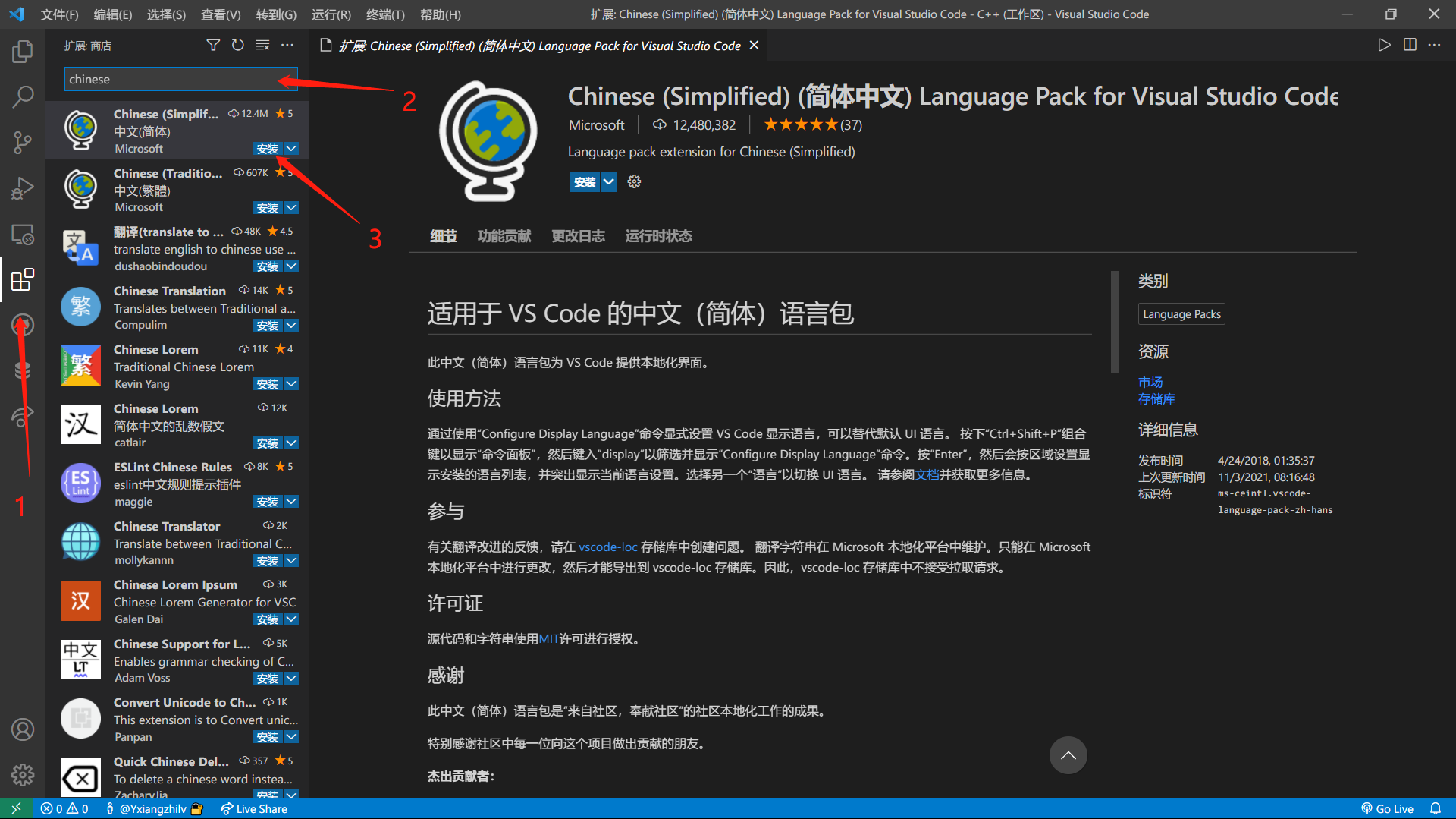 打开VSC后点击左边的这个位置,然后在输入框输入 chinese 安装中文插件: