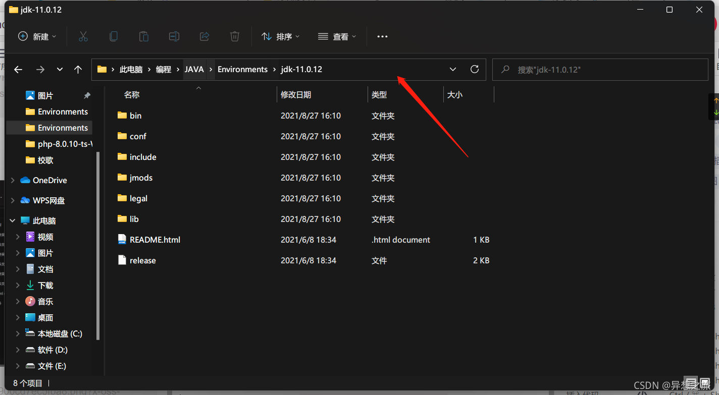 当然如果选择的版本不一样图一中的文件名不同,但是格式应该一样(如果你图一中的文件名的是jdk-11.0.12_windows-x64_bin ,请点开之后将里面那一层文件夹拖出来就会得到上图的文件名)
