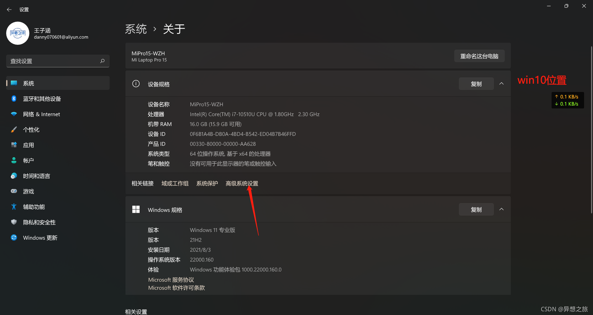 然后win11如图,win10大概在屏幕右侧,有“高级系统设置”的链接