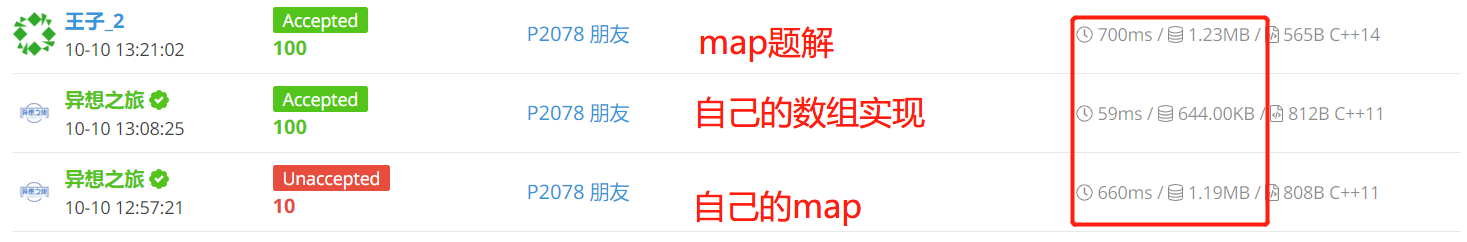 比较这三次的用时,可以看出其实map在时间和空间都没有优势……所以可能只是题解优化稍微好点 然后我的超时/超内存了?