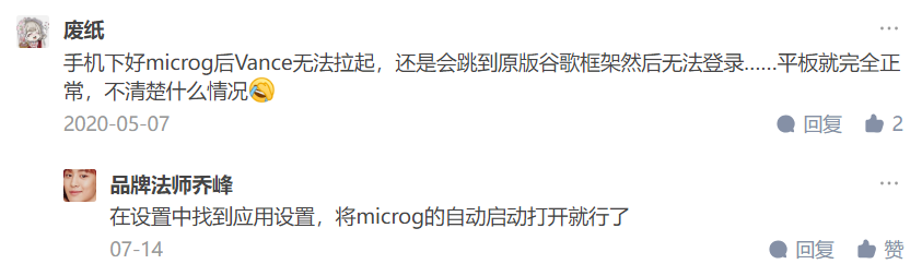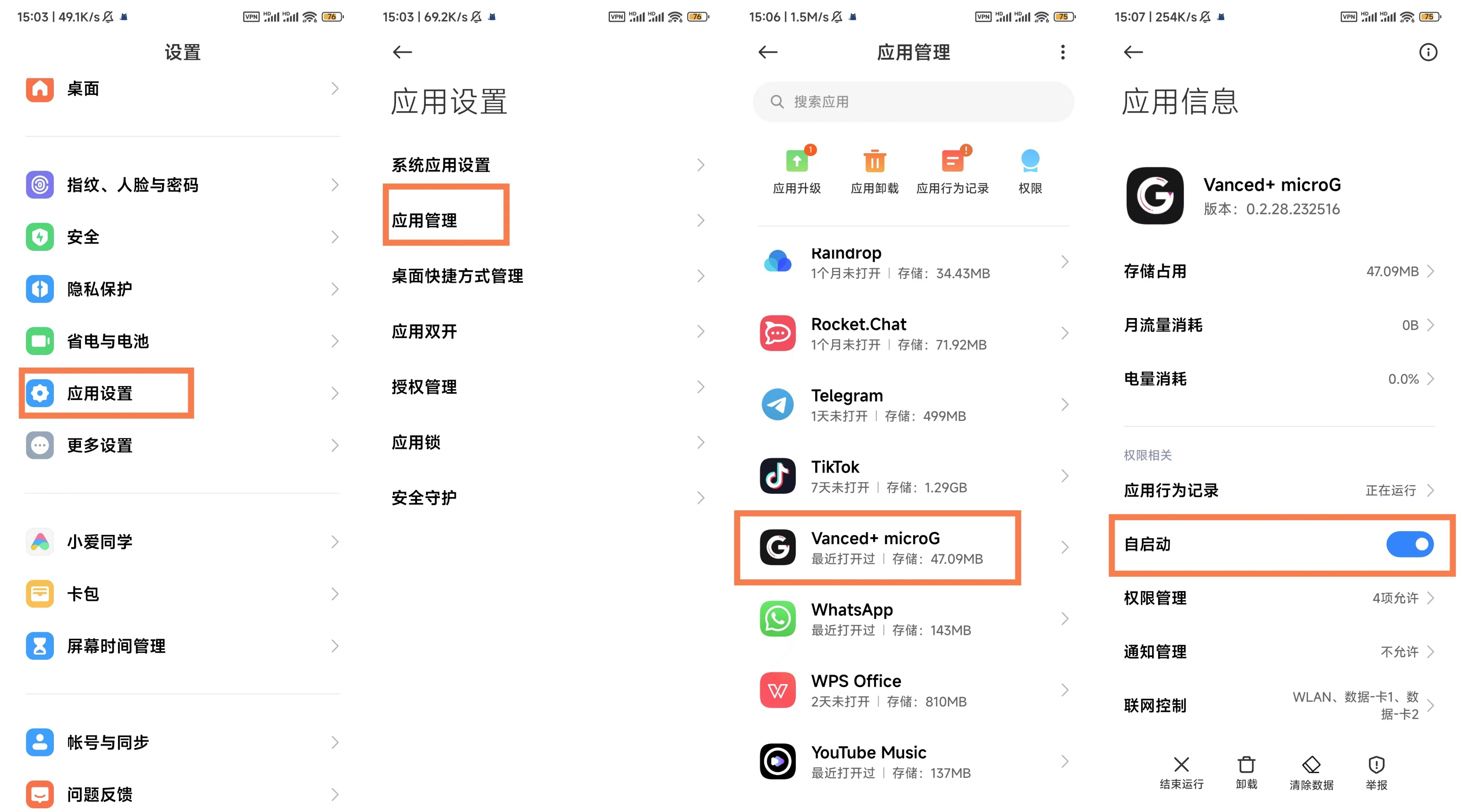 事实上,这里打开自启动开关是为了让稍后安装的 YouTube Vanced 能够唤醒 MicroG,而非真正意义上的自启动。