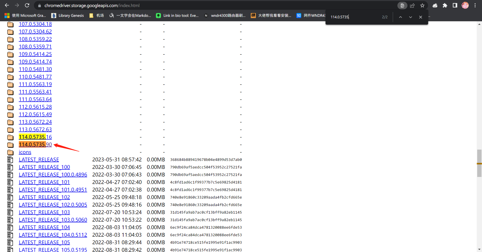 google-chrome -version然后在 https://chromedriver.storage.googleapis.com/index.html 中寻找对应版本的 Chrome Driver(可使用 Ctrl + F 进行搜索)。没有完全对应的版本没关系,下载一个与之最接近的即可,例如我的版本号为 114.0.5735.198,于是我选择了 114.0.5735.90。