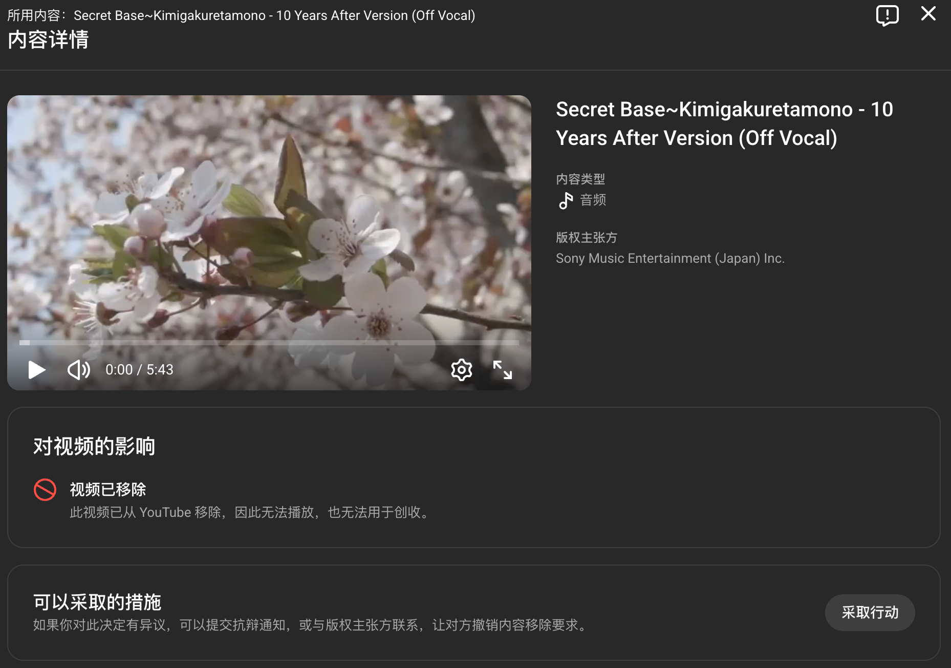 视频临近结尾处包含了几秒钟金家岭学校2021届毕业视频片段,其中使用的背景音乐是周深的《未闻花名》。未曾设想的是,这会让我们在上传 YouTube 时遇到麻烦。也许是由于我们选取的片段没有唱词,日本索尼音乐娱乐公司认为我们使用的音乐是他们享有版权的《Secret Base》,尽管我们举证说明这首歌是翻唱版本,对方仍然向 YouTube 提出了视频移除请求,导致我们的视频被下架。