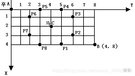 棋盘用坐标表示,A 点 (0,0)、B 点 (n,m),同样马的位置坐标是需要给出的。