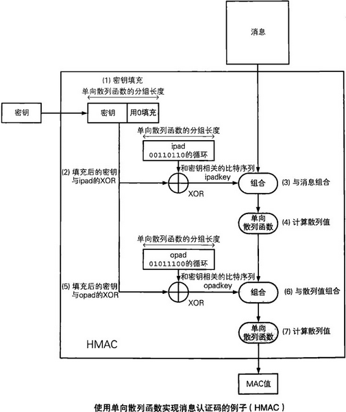 - 如果密钥比分组长度短,则末尾填充0直到达到分组长度;如果密钥比分组长度还长,则会用哈希计算出密钥的散列值,然后让这个散列值作为HMAC的密钥,散列长度一般仍然小于分组长度,所以散列之后仍然要填充0。