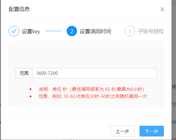 点击下一步进行配置调用时间,说明:单位 秒(最低调用频率为 60 秒,最高为6小时),例如: 30-60,代表在30秒-60秒之间随机调用一次