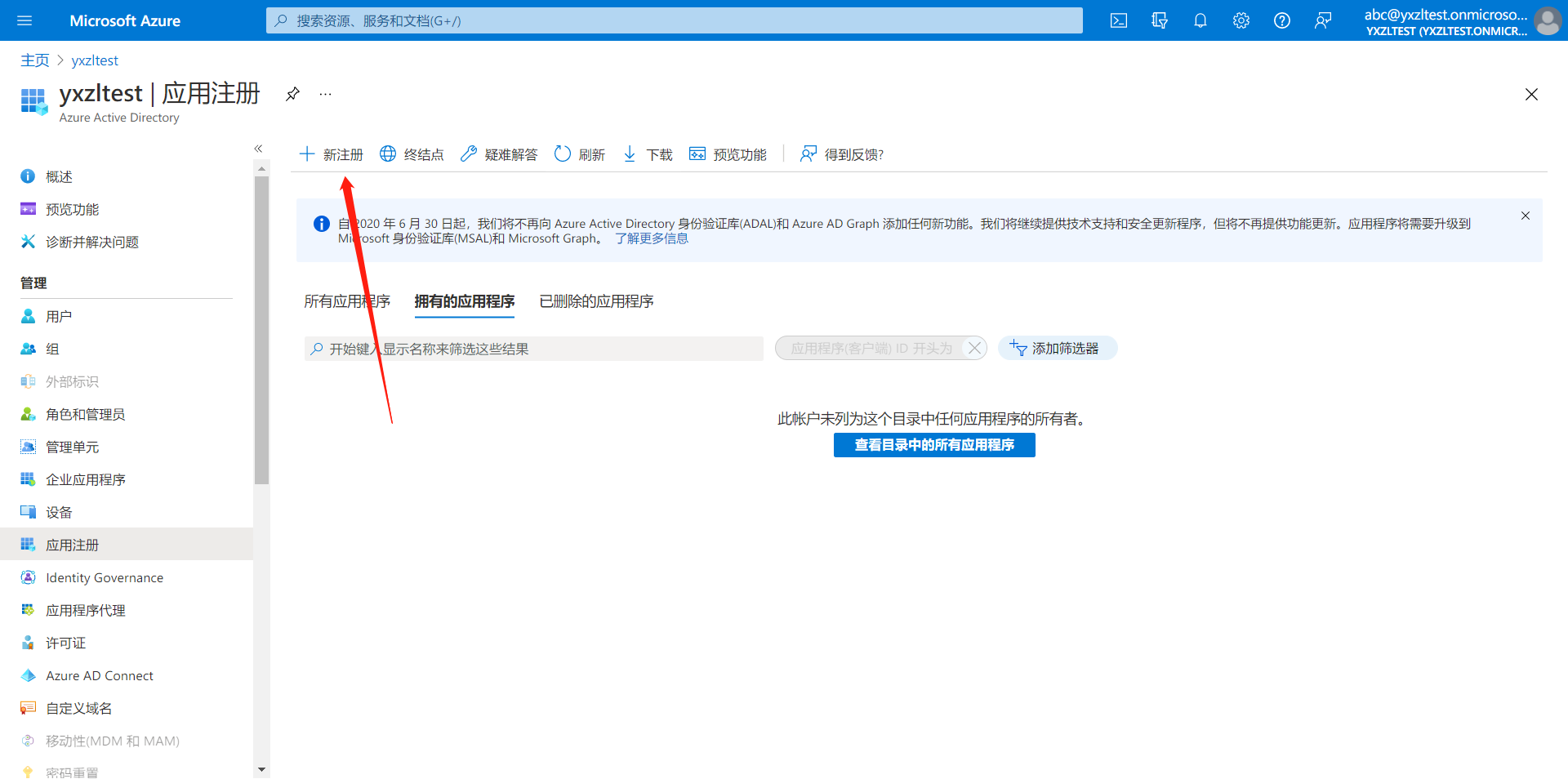 点击直达链接:https://portal.azure.com/#blade/Microsoft_AAD_IAM/ActiveDirectoryMenuBlade/RegisteredApps