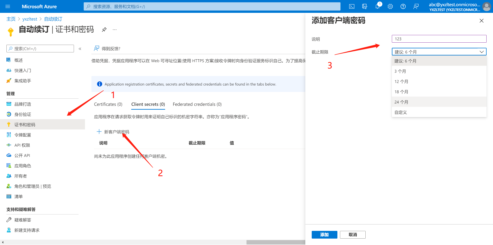 2021-08-19: 有些教程让你选永久,然而客户端密码这里过期时间已经没有了“从不”,只能选2年。(别在意这些,谁也不知道2年后微软的策略会不会变,2年换一次密钥也不麻烦)