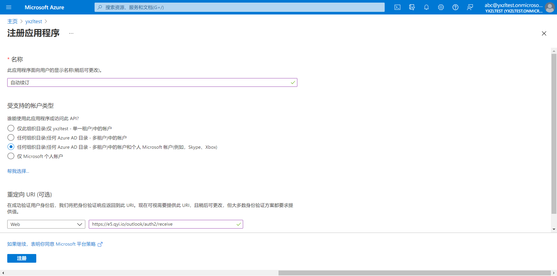 https://e5.qyi.io/outlook/auth2/receive2020-03-02 15:32 小伙伴们注意了,这里受支持的账户类型 重定向 URI (可选)一定要填对,不然无法授权的哦。