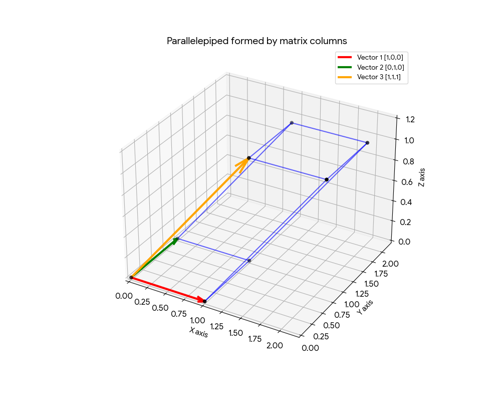 For example, for the 3×3 matrix A=100010111, the column vectors are 100, 010, and 111, and the parallelepiped formed by these three vectors looks like this: